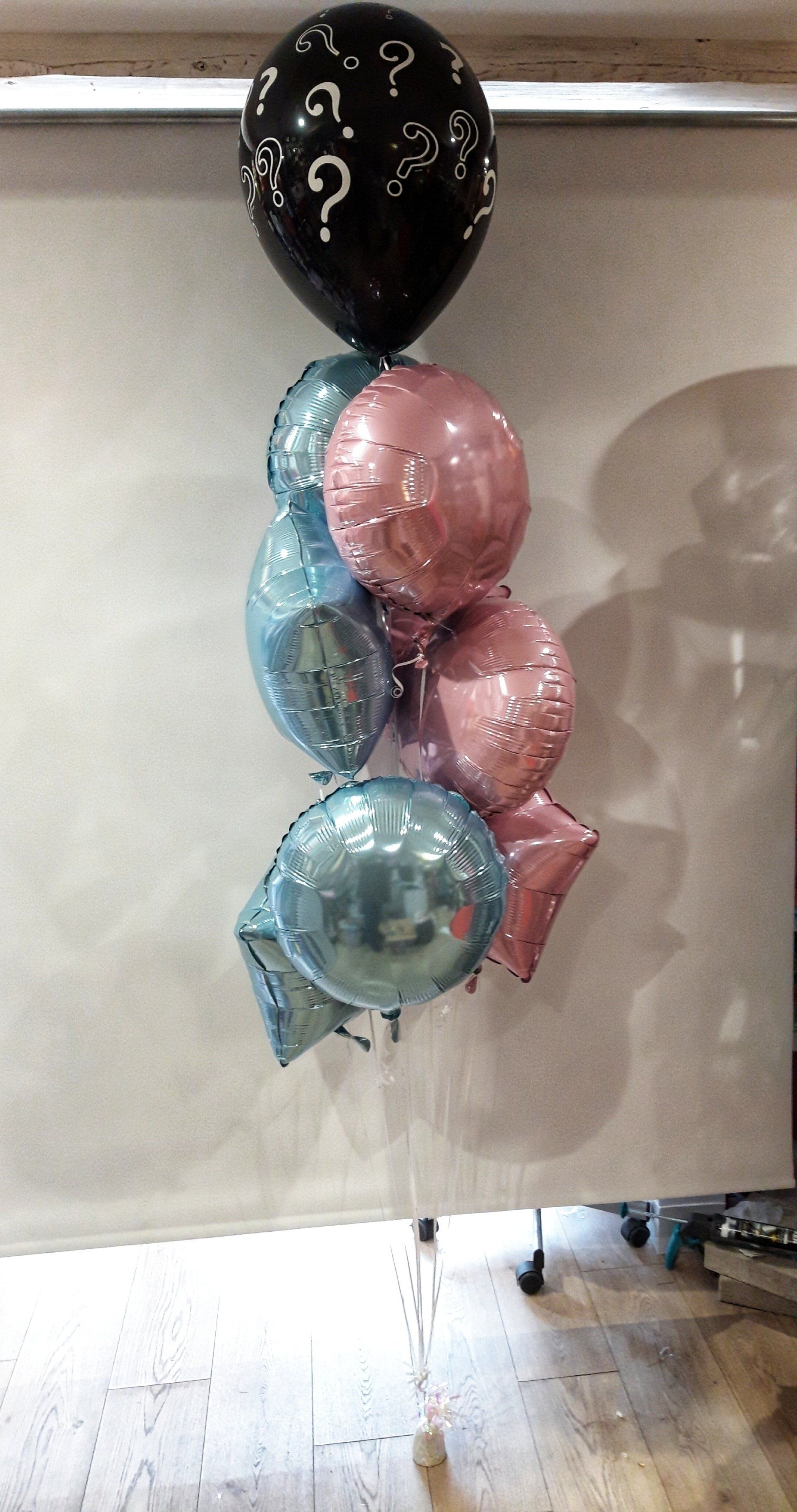 Bouquet de 4 ballons aluminim rose, 4 ballons aluminium bleu, 1 ballon noir avec des points d'interrogation 45cm et des confettis, 1 poid.